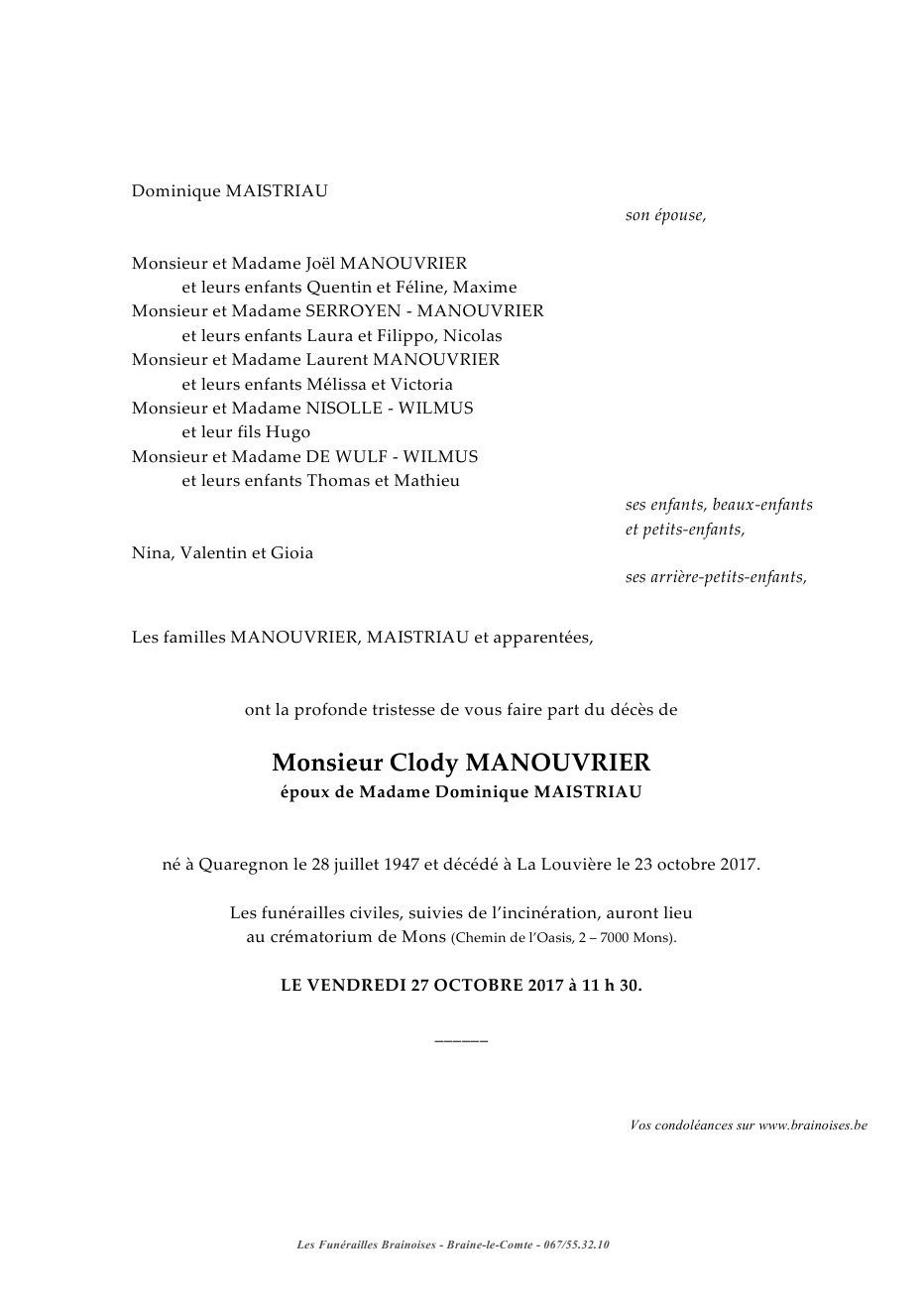 Décédé à La Louvière (7100) le lundi 23 octobre 2017 à l'âge de 70 ans