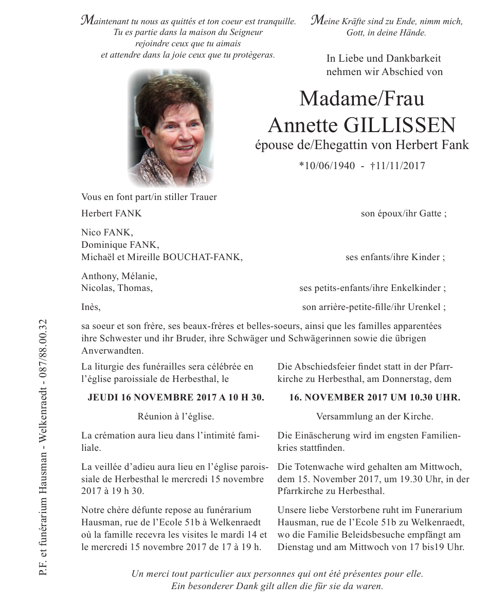 Décédée à Verviers (4800) le samedi 11 novembre 2017 à l'âge de 77 ans
