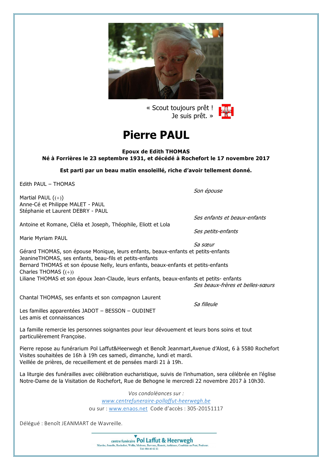 Décédé à Rochefort (5580) le vendredi 17 novembre 2017 à l'âge de 86 ans