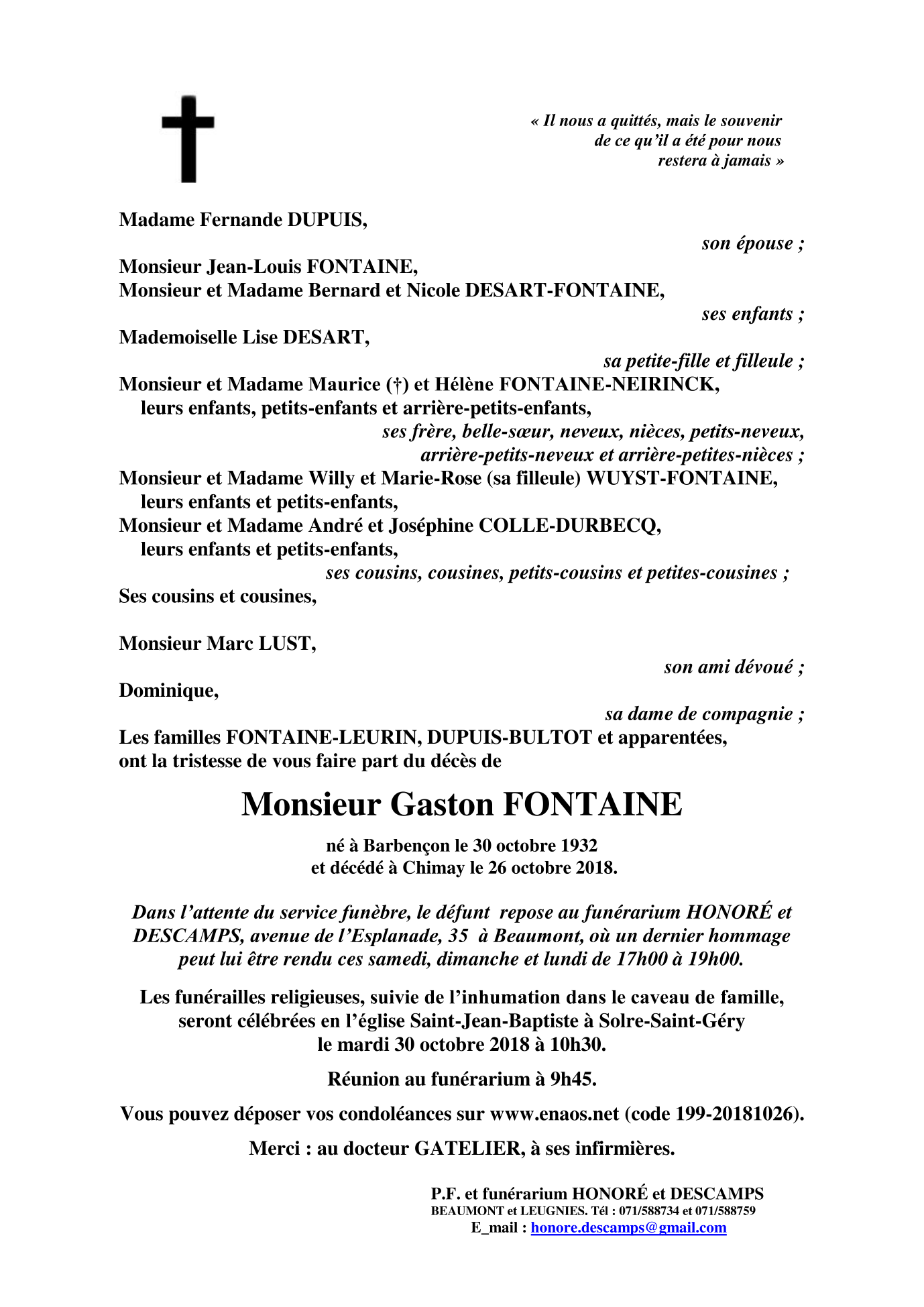 Décédé à Chimay (6460) le vendredi 26 octobre 2018 à l'âge de 85 ans