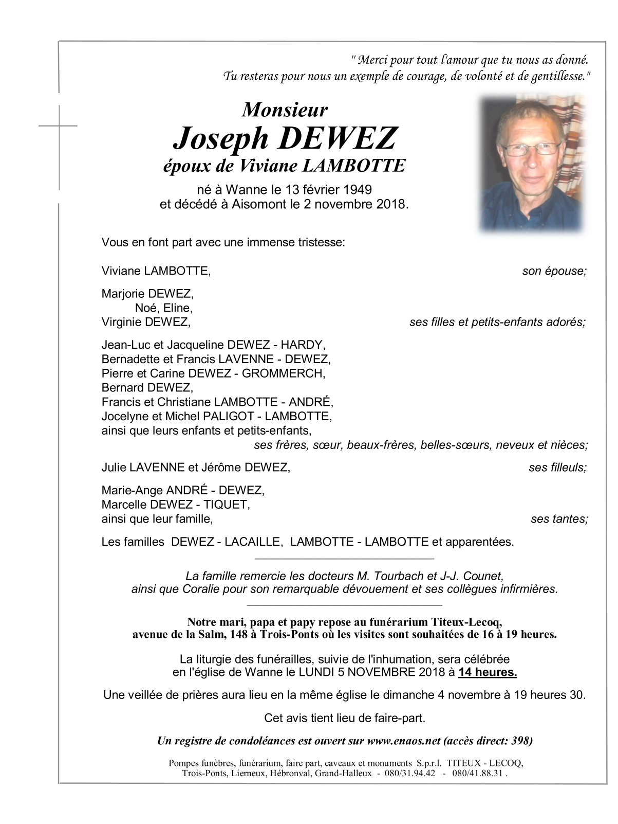 Décédé à Aisomont (4980) le vendredi 2 novembre 2018 à l'âge de 69 ans