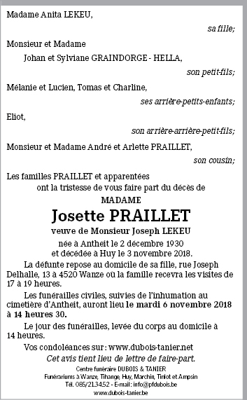 Décédée à Huy (4500) le samedi 3 novembre 2018 à l'âge de 87 ans