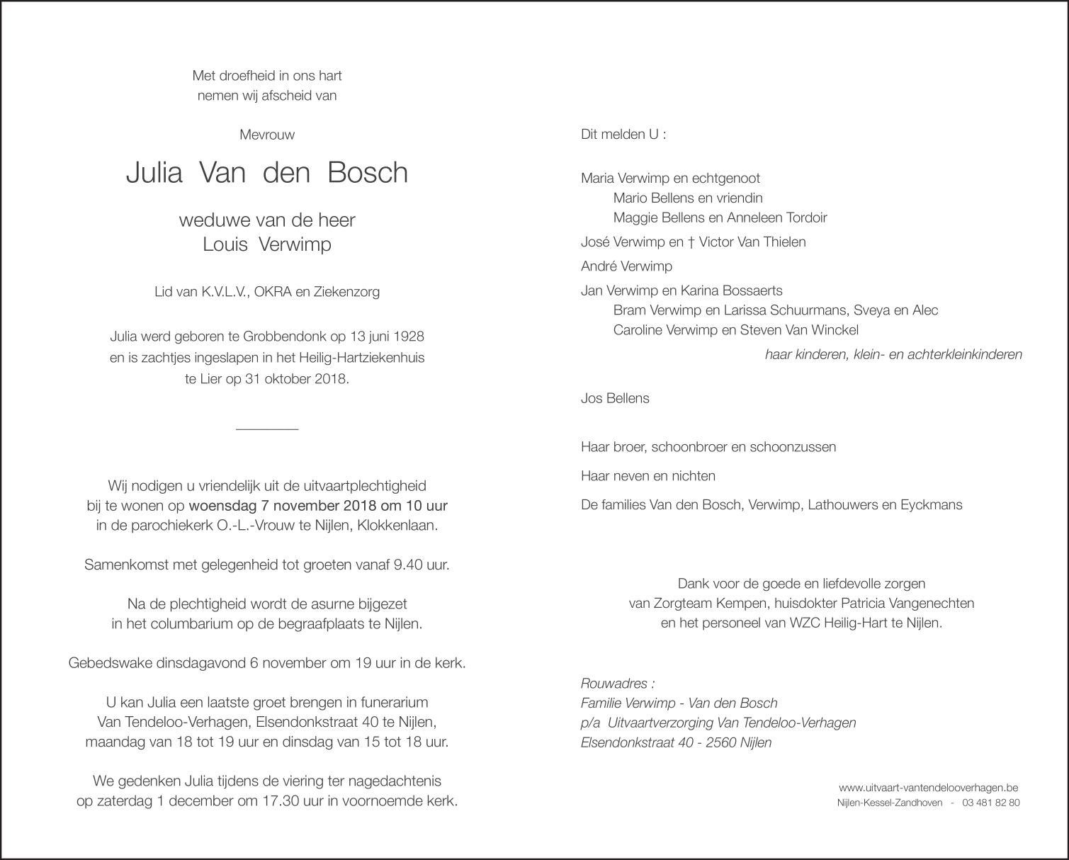Décédée à Lier (2500) le mardi 30 octobre 2018 à l'âge de 90 ans