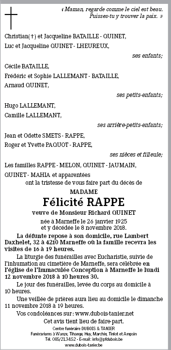Décédée à Marneffe (4210) le jeudi 8 novembre 2018 à l'âge de 93 ans