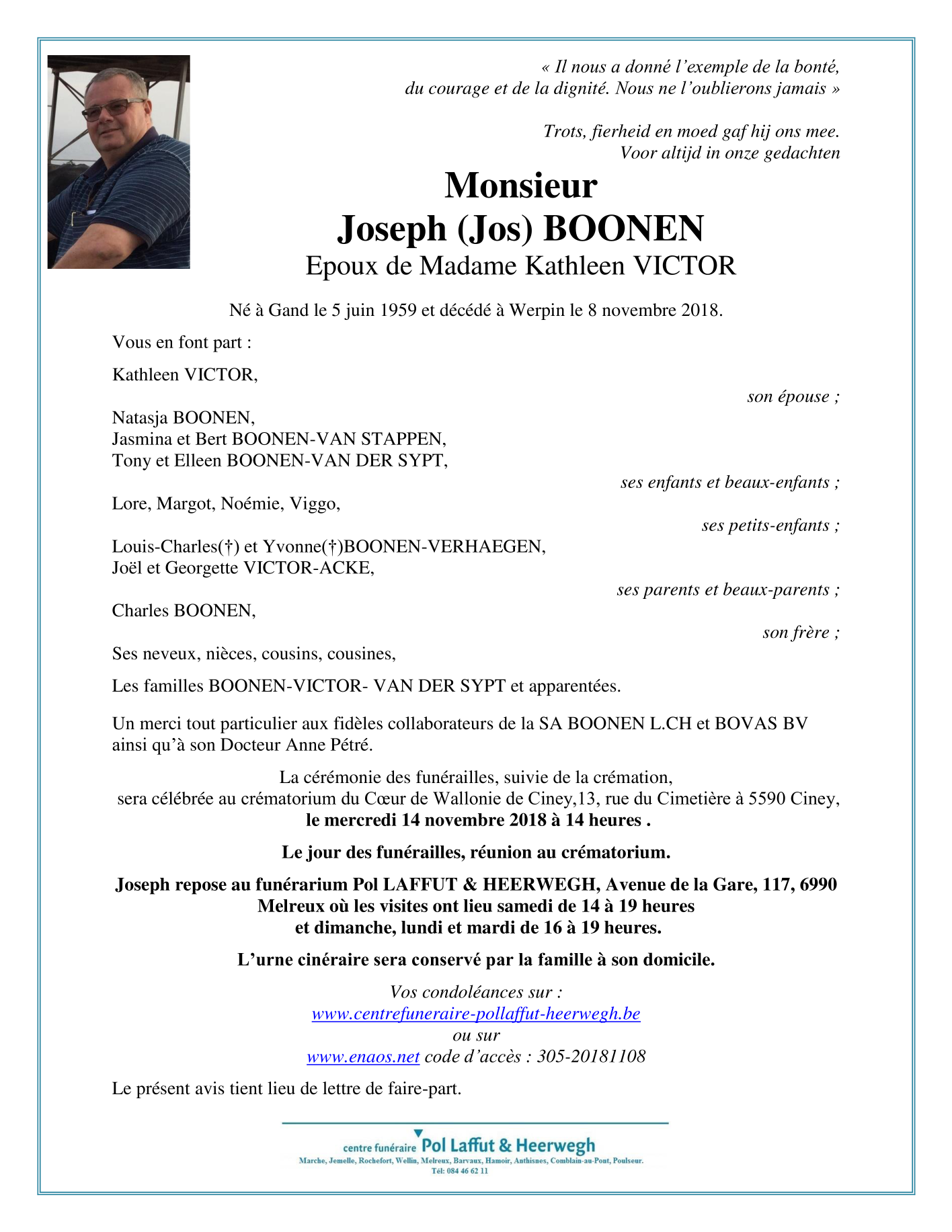 Décédé à Werpin (6990) le jeudi 8 novembre 2018 à l'âge de 59 ans
