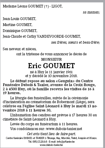 Décédé à Huy (4500) le samedi 10 novembre 2018 à l'âge de 57 ans