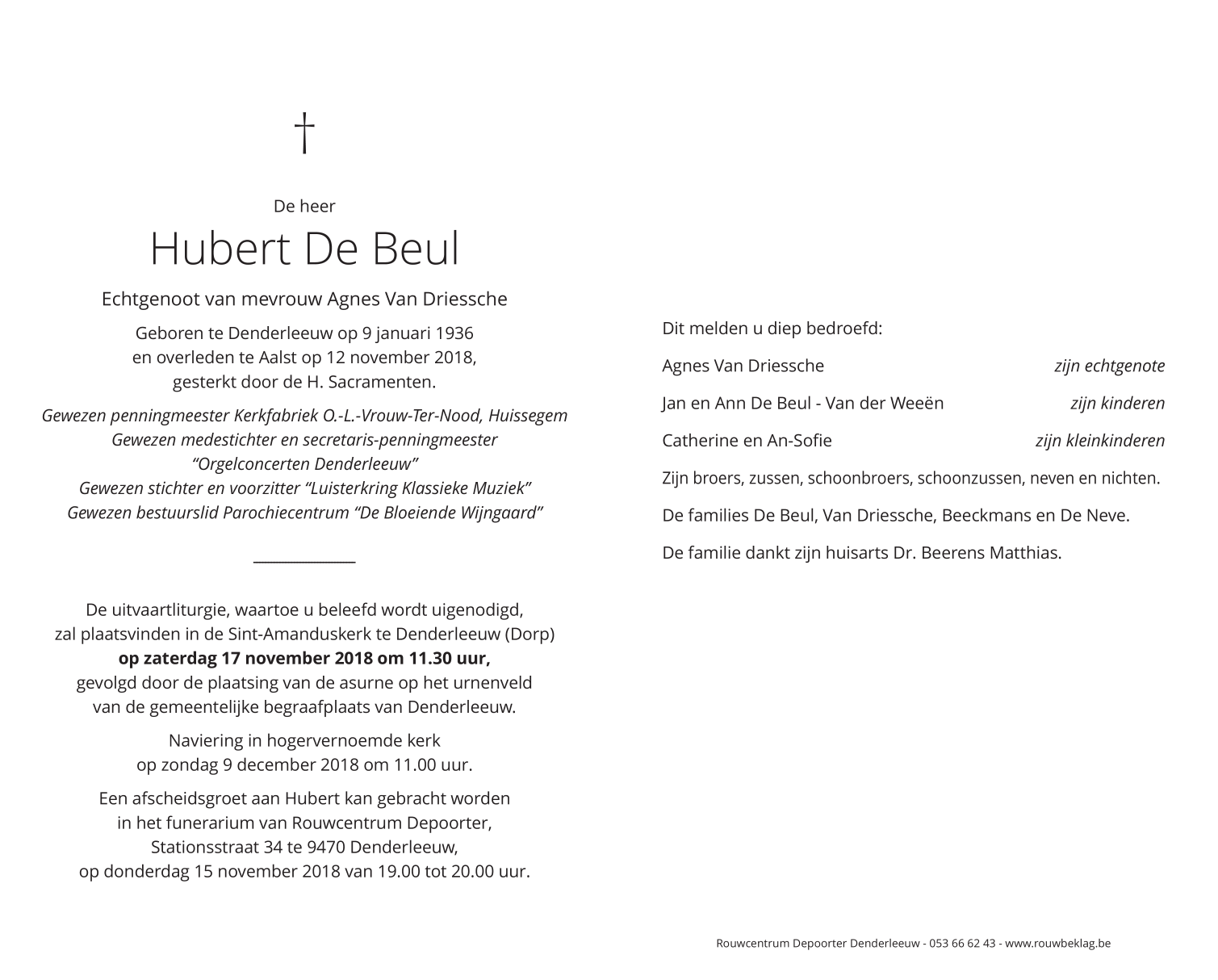 Décédé à Aalst (9300) le lundi 12 novembre 2018 à l'âge de 82 ans