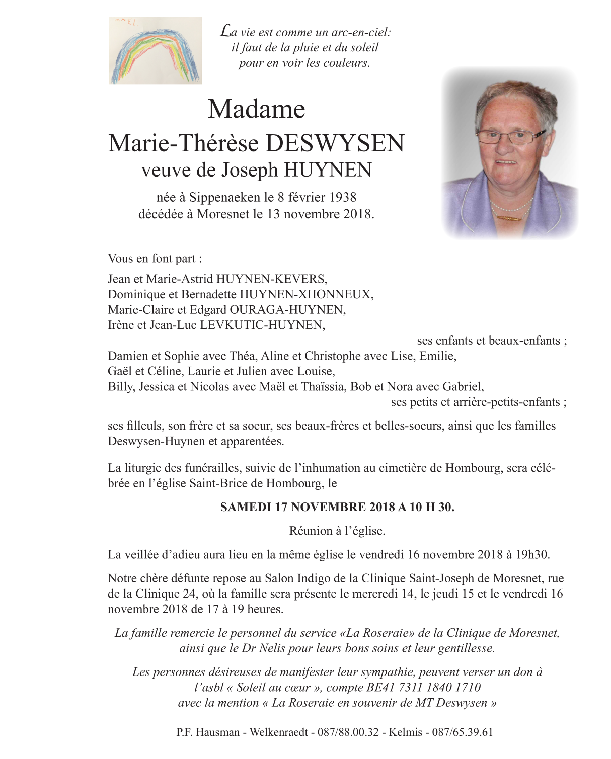 Décédée à Moresnet (4850) le mardi 13 novembre 2018 à l'âge de 80 ans