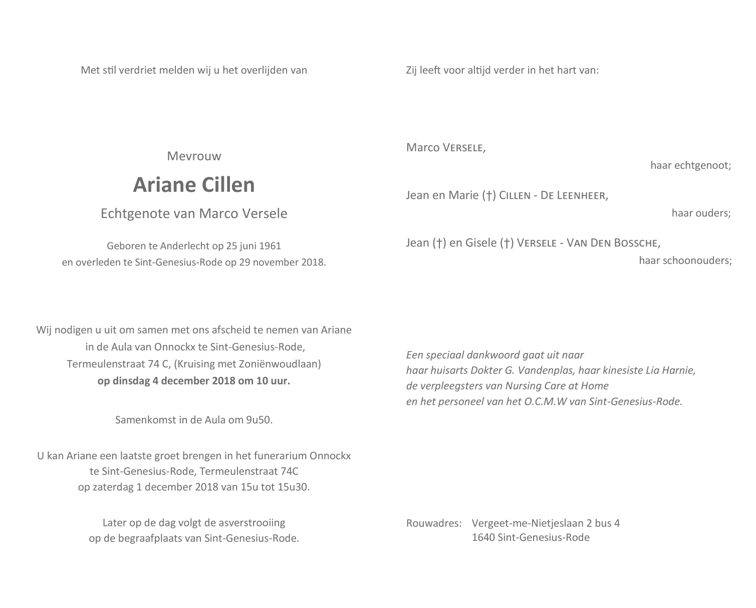 Décédée à Sint-Genesius-Rode (1640) le jeudi 29 novembre 2018 à l'âge de 57 ans