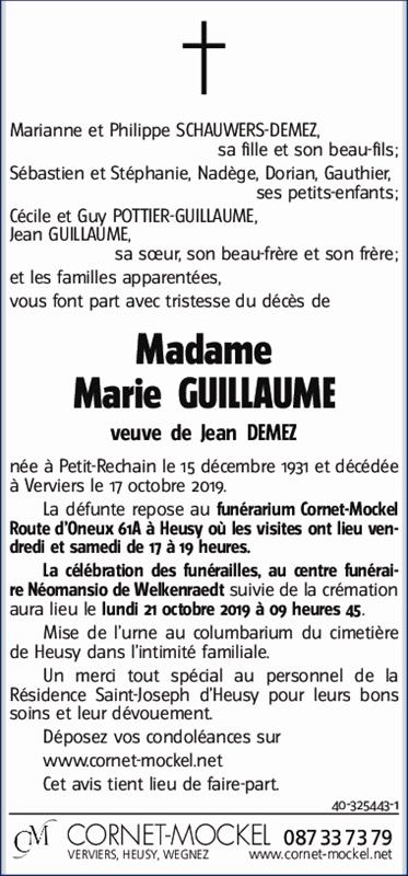 Décédée à Verviers (4800) le jeudi 17 octobre 2019 à l'âge de 87 ans