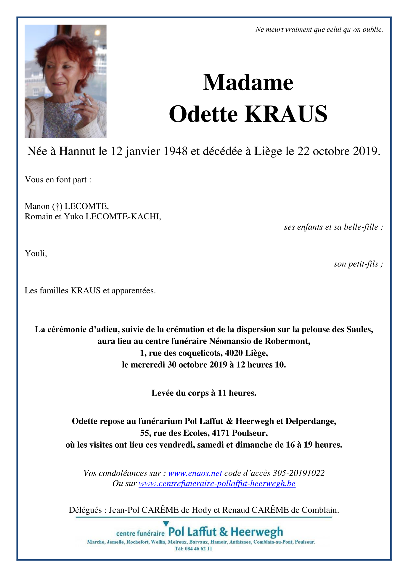 Fallecida en Liège (4000) el martes, 22 de octubre de 2019 a la edad de 71 años