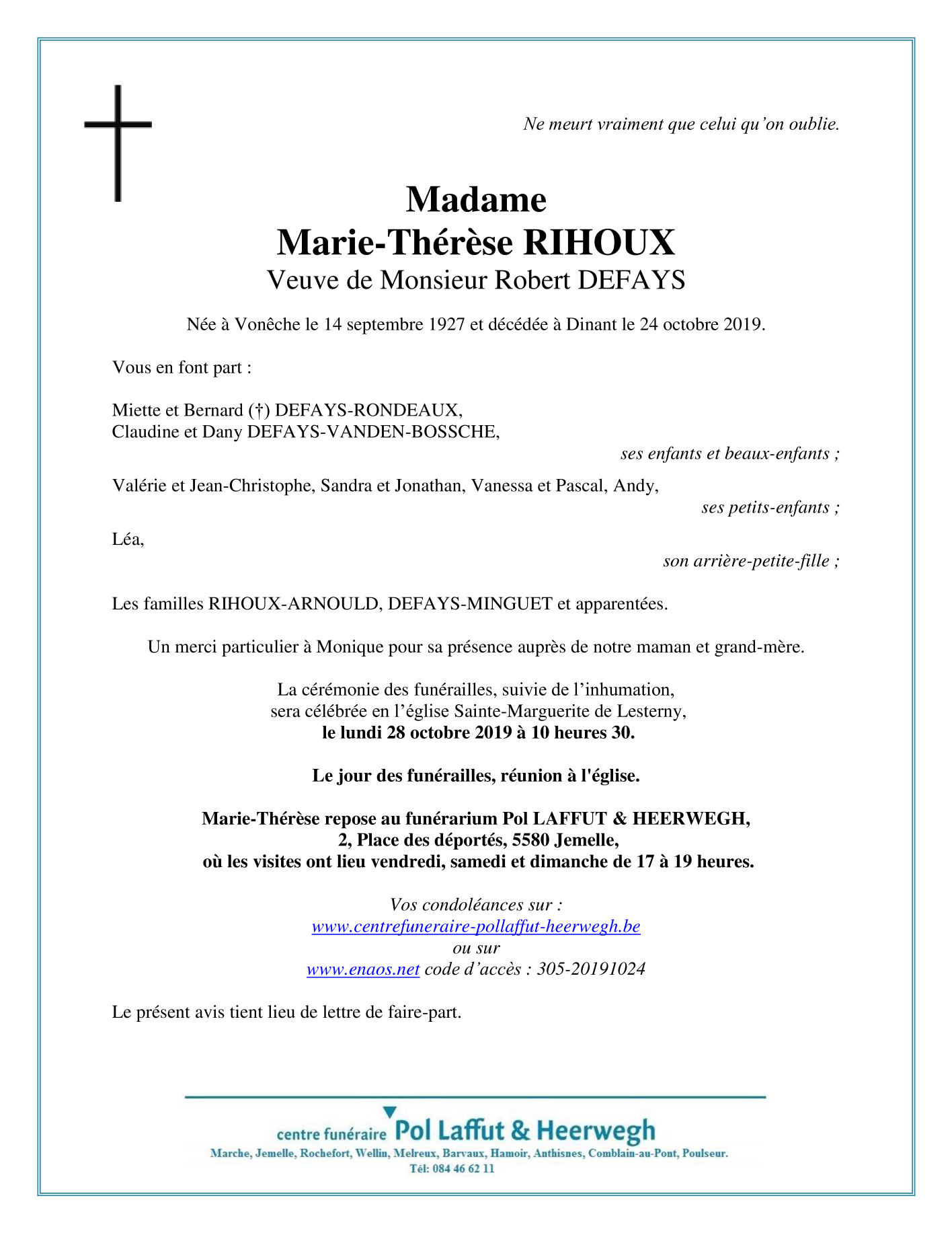 Décédée à Dinant (5500) le jeudi 24 octobre 2019 à l'âge de 92 ans