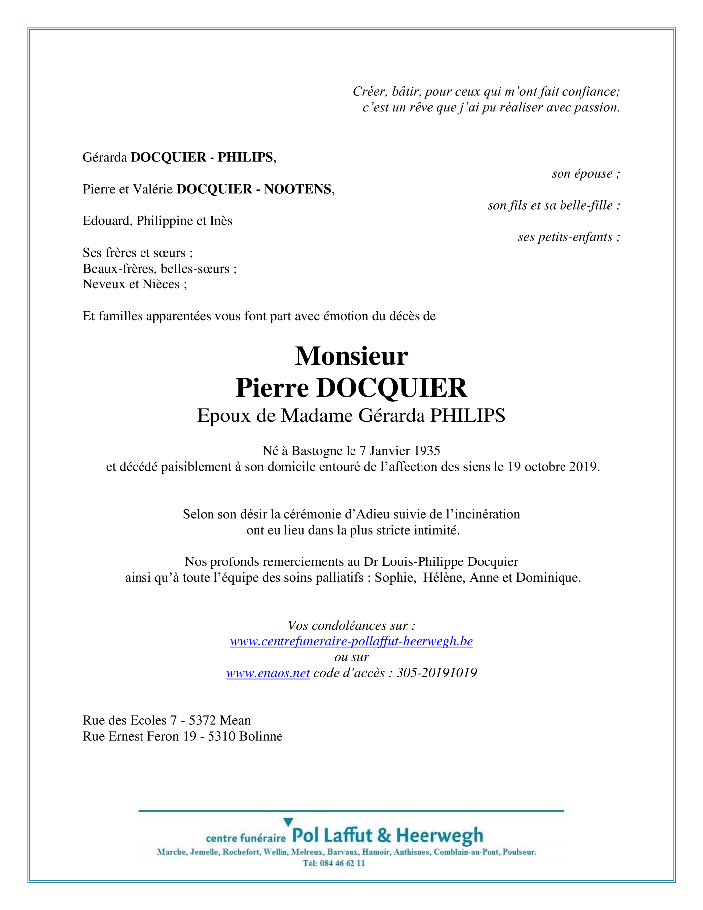 Décédé à Méan (5372) le samedi 19 octobre 2019 à l'âge de 84 ans