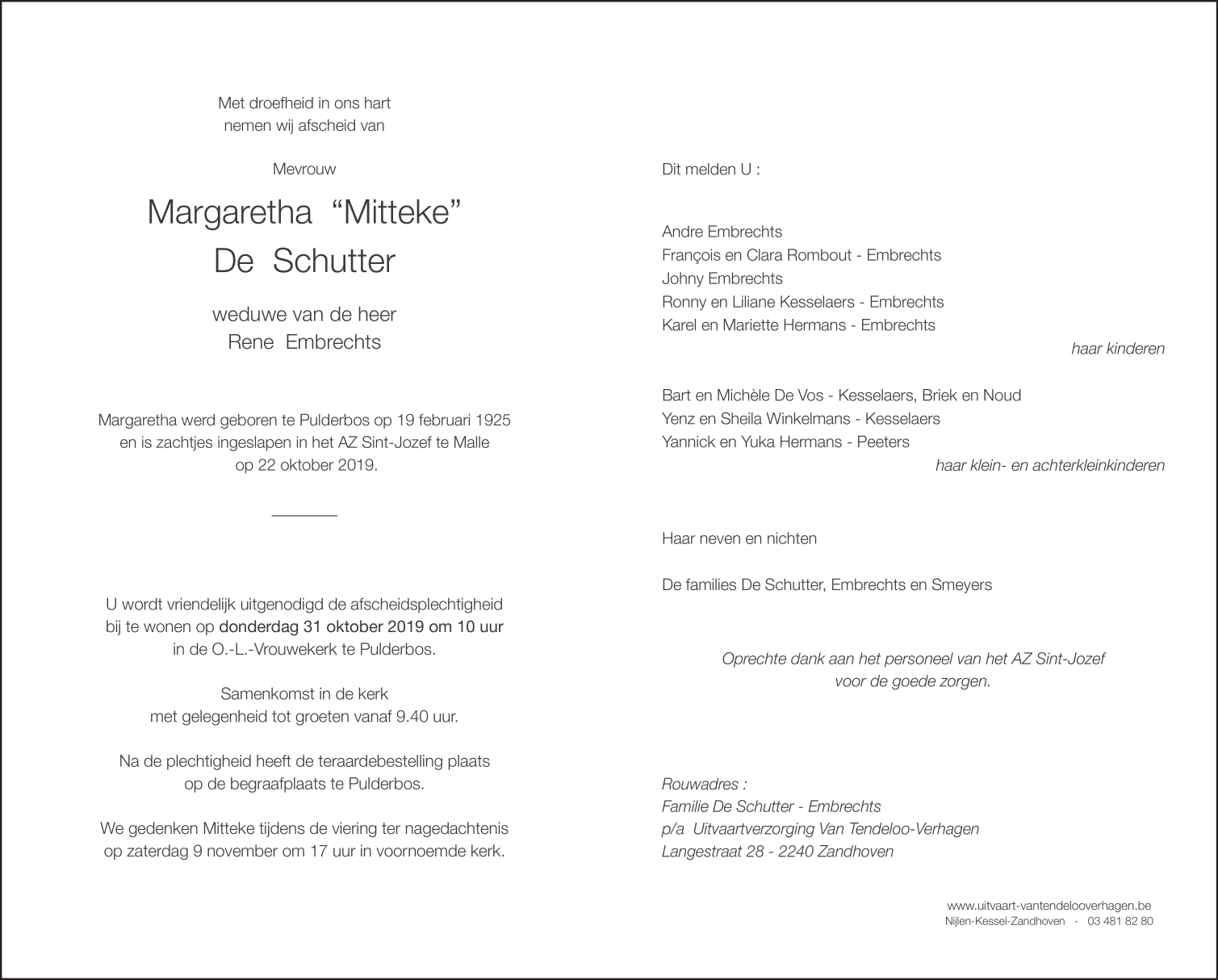 Décédée à Malle (2390) le mardi 22 octobre 2019 à l'âge de 94 ans