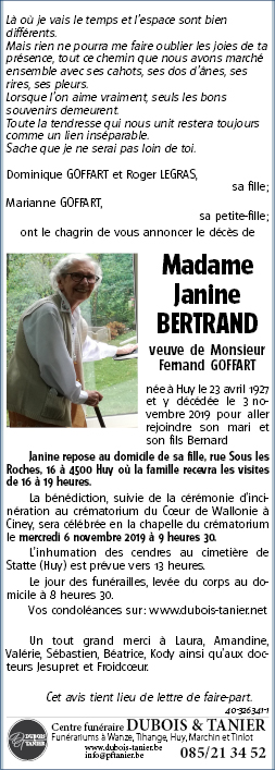 Overleden te Huy (4500) op zondag 3 november 2019 op 92-jarige leeftijd