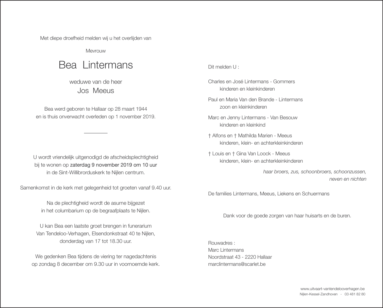 Décédée à Nijlen (2560) le vendredi 1 novembre 2019 à l'âge de 75 ans