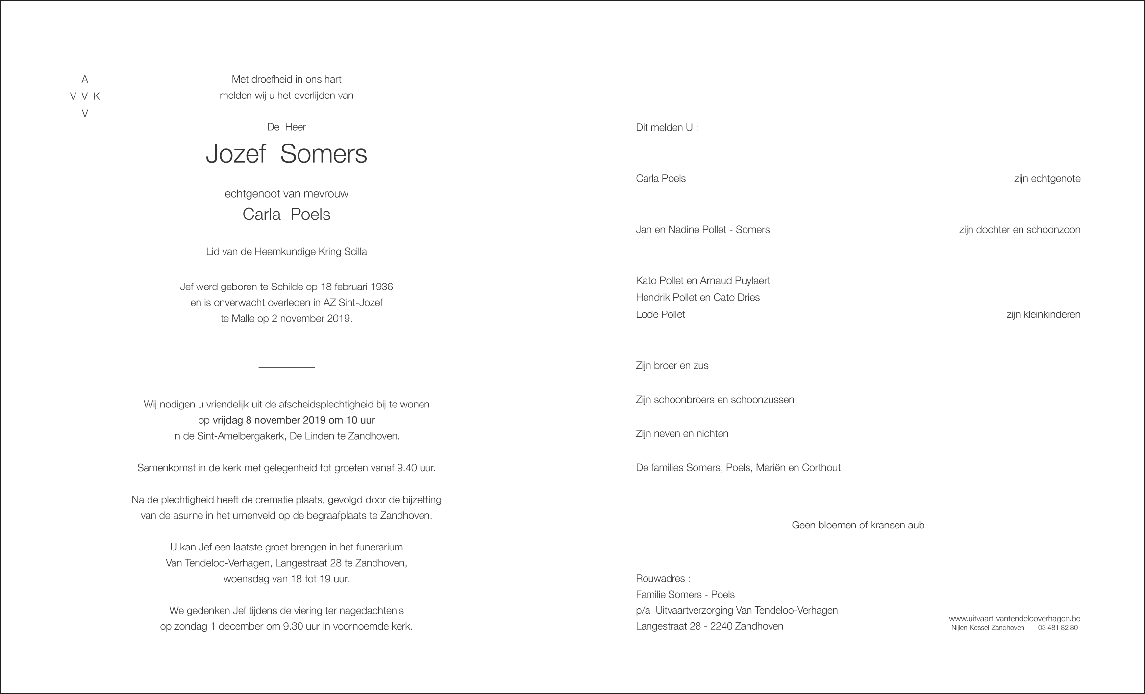 Décédé à Malle (2390) le samedi 2 novembre 2019 à l'âge de 83 ans
