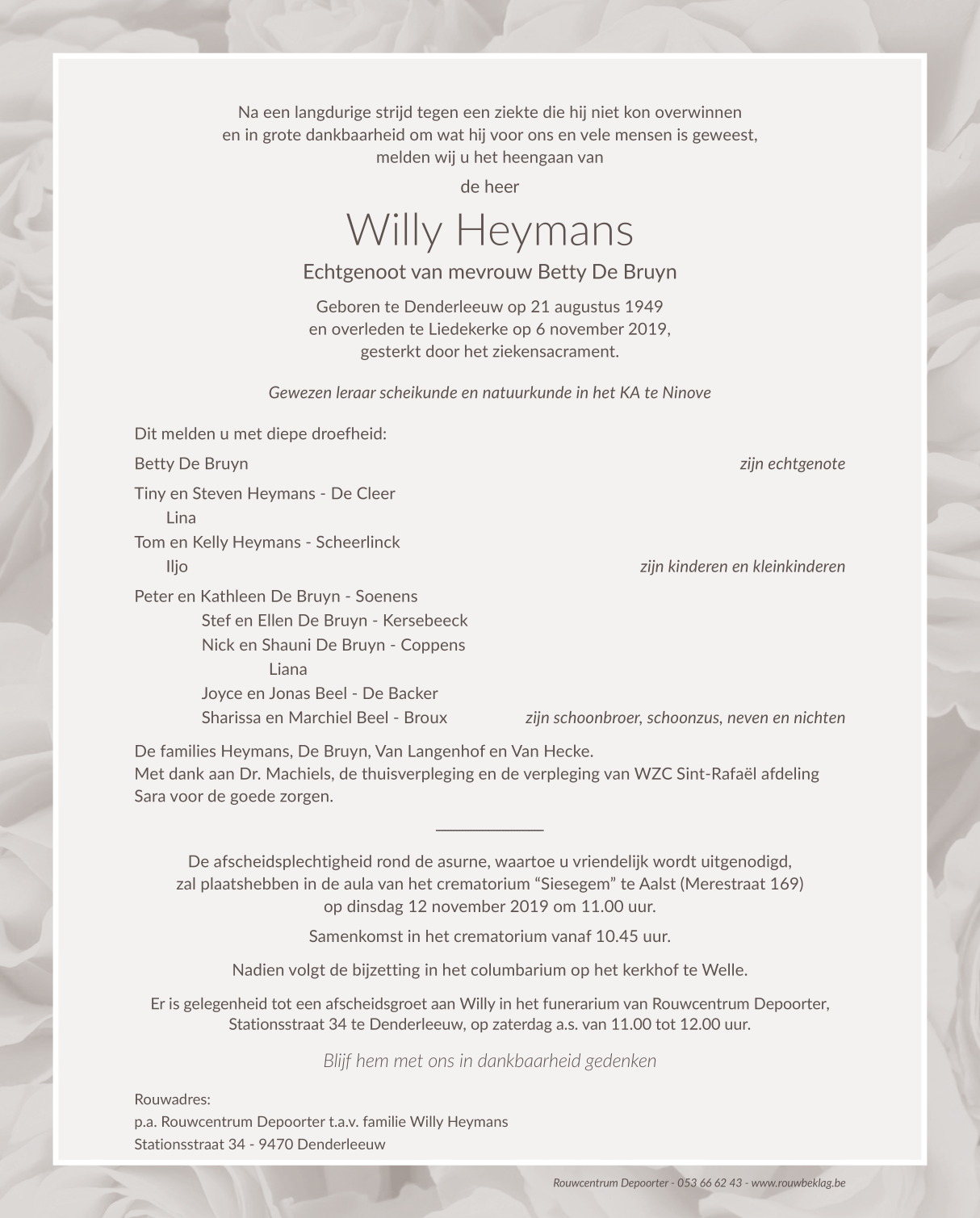 Décédé à Liedekerke (1770) le mercredi 6 novembre 2019 à l'âge de 70 ans