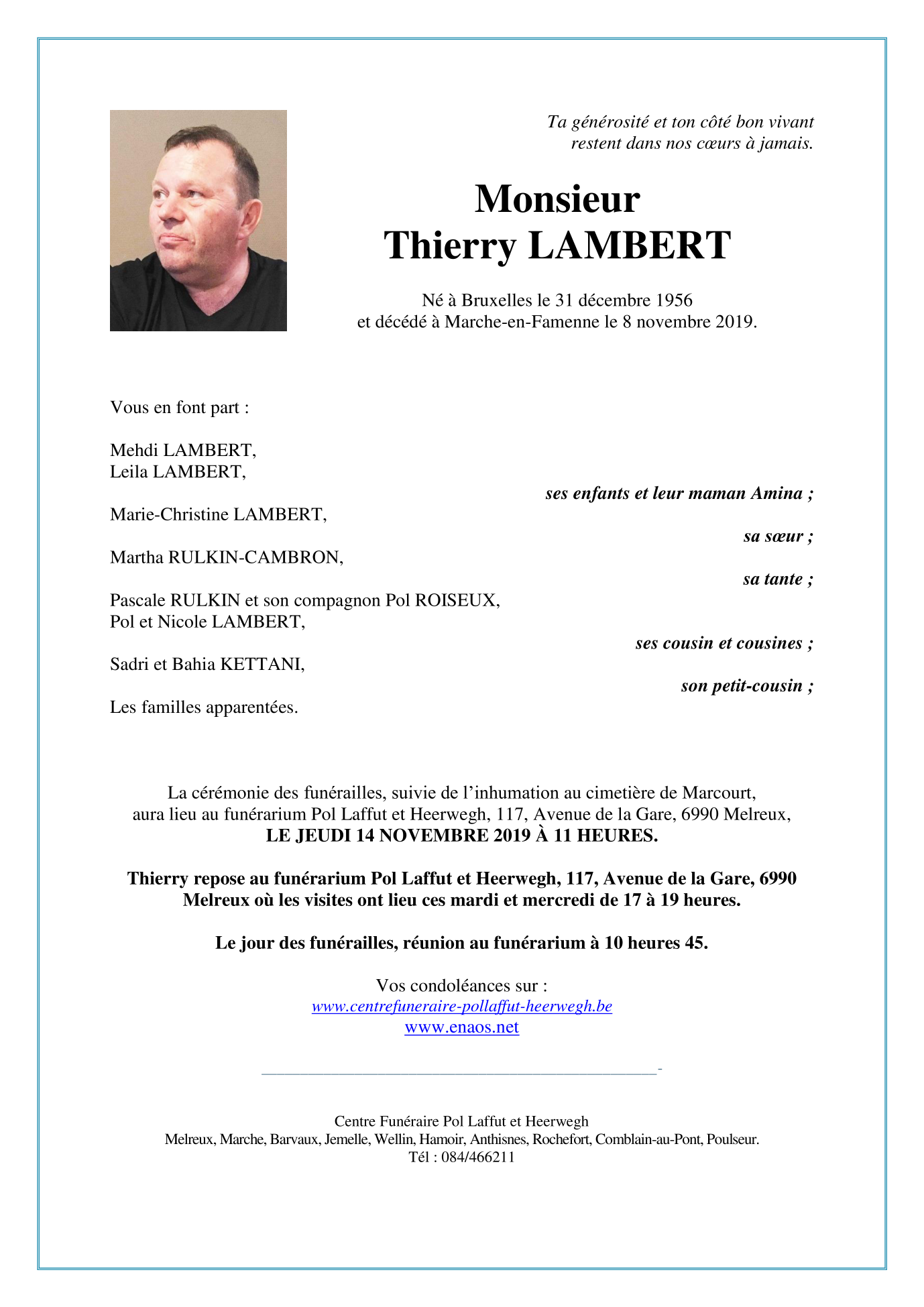 Décédé à Marche-en-Famenne (6900) le vendredi 8 novembre 2019 à l'âge de 62 ans