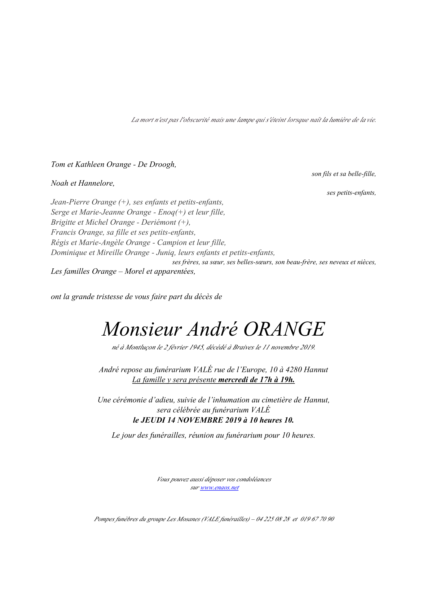 Décédé à Braives (4260) le lundi 11 novembre 2019 à l'âge de 74 ans