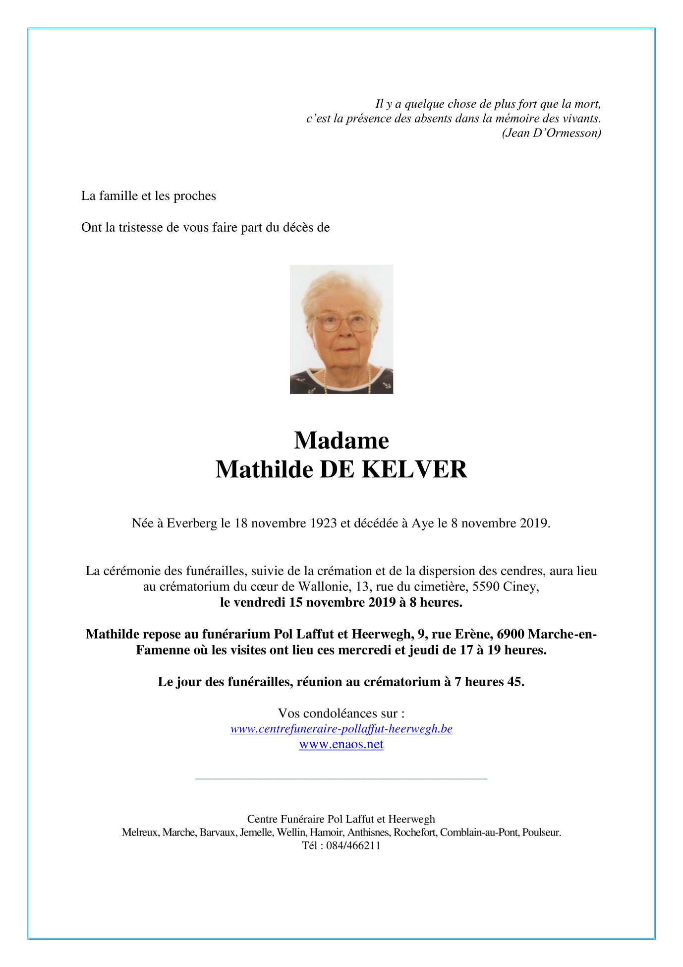 Décédée à Marche-en-Famenne (6900) le vendredi 8 novembre 2019 à l'âge de 96 ans