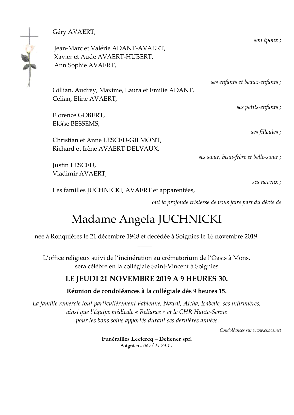 Décédée à Soignies (7060) le samedi 16 novembre 2019 à l'âge de 70 ans