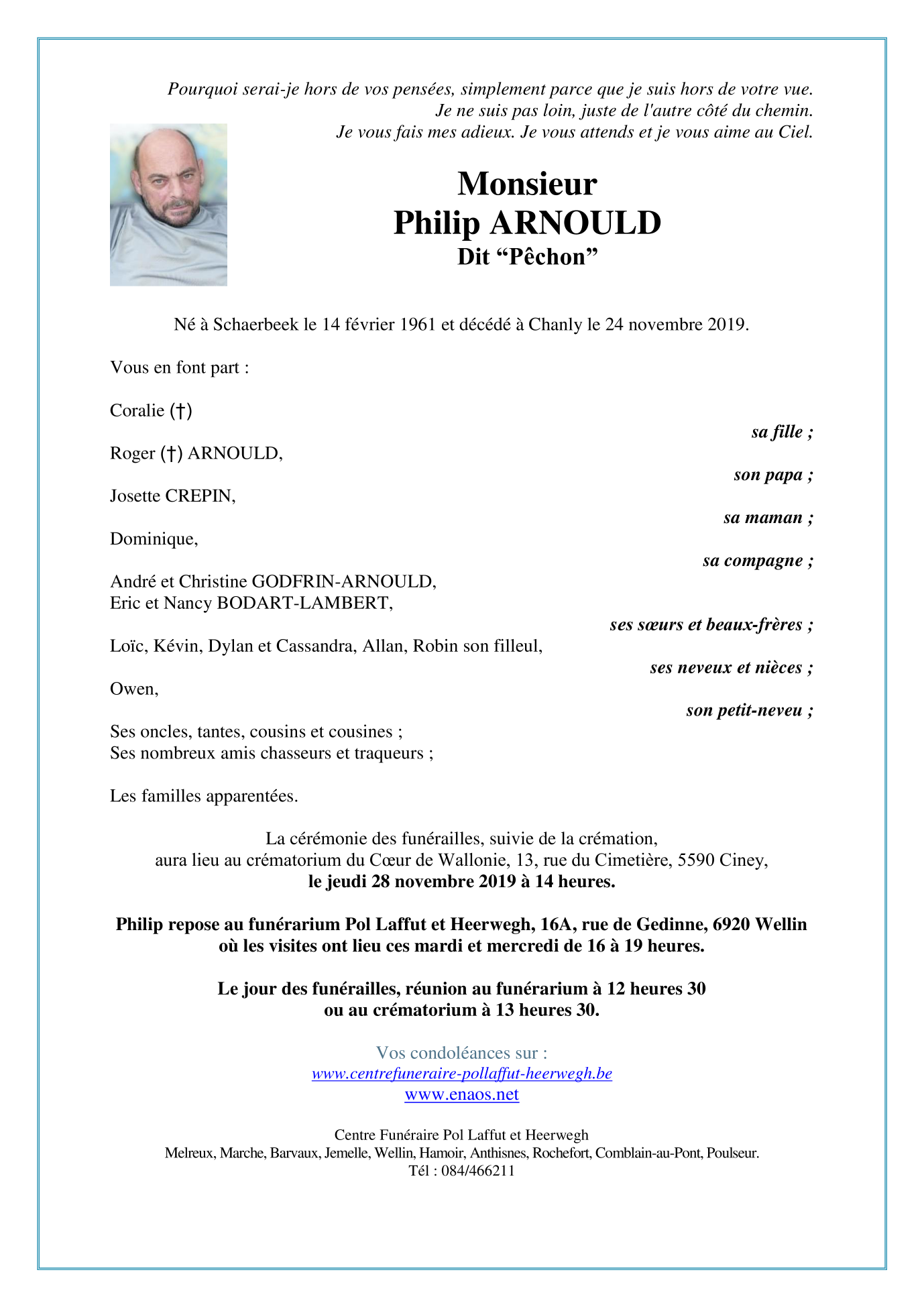 Décédé à Chanly (6921) le dimanche 24 novembre 2019 à l'âge de 58 ans