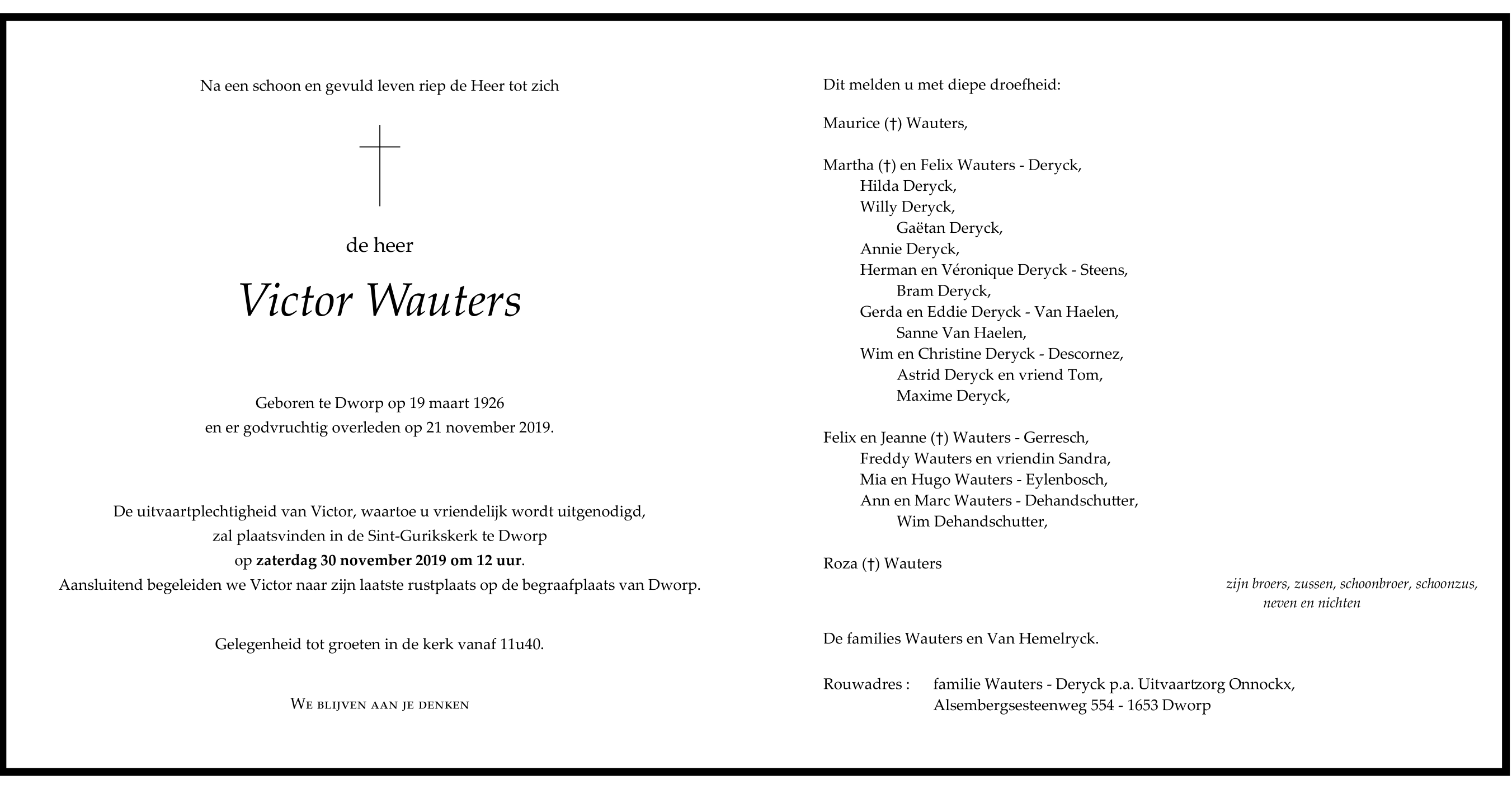 Décédé à Dworp (1653) le jeudi 21 novembre 2019 à l'âge de 93 ans