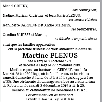 Décédée à Liège (4000) le mercredi 27 novembre 2019 à l'âge de 59 ans