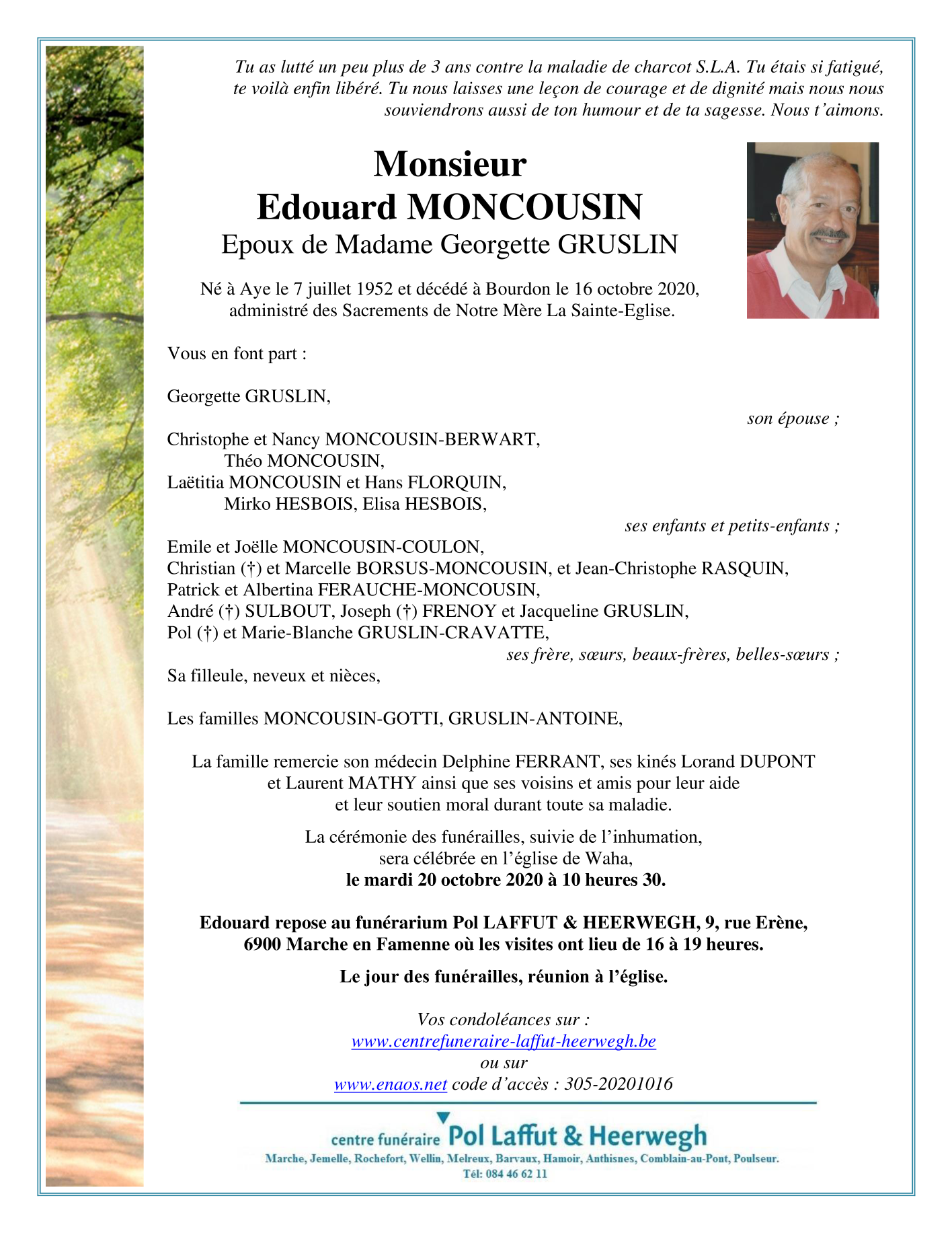 Décédé à Bourdon (6990) le vendredi 16 octobre 2020 à l'âge de 68 ans