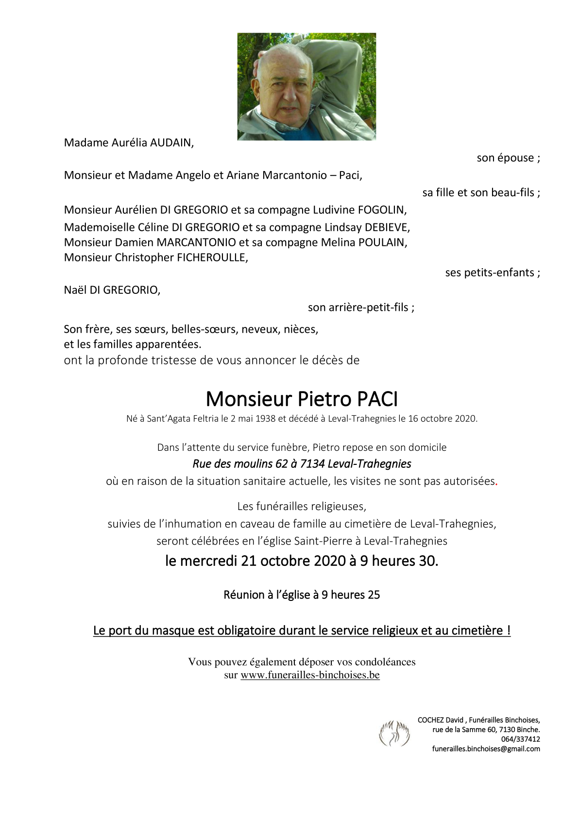 Décédé à Leval-Trahegnies (7134) le vendredi 16 octobre 2020 à l'âge de 82 ans