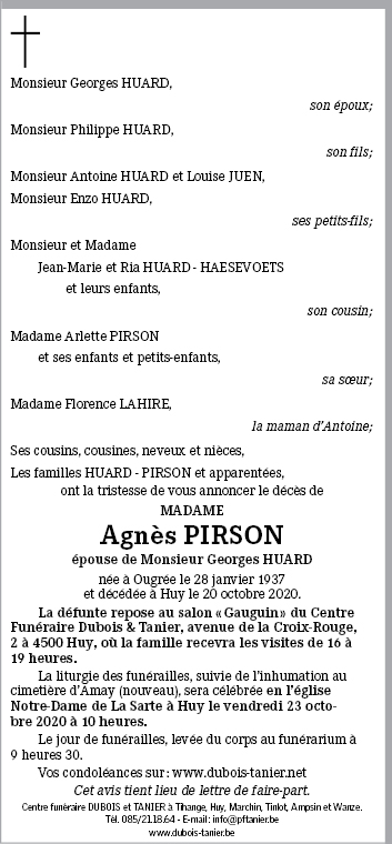 Décédée à Huy (4500) le mardi 20 octobre 2020 à l'âge de 83 ans