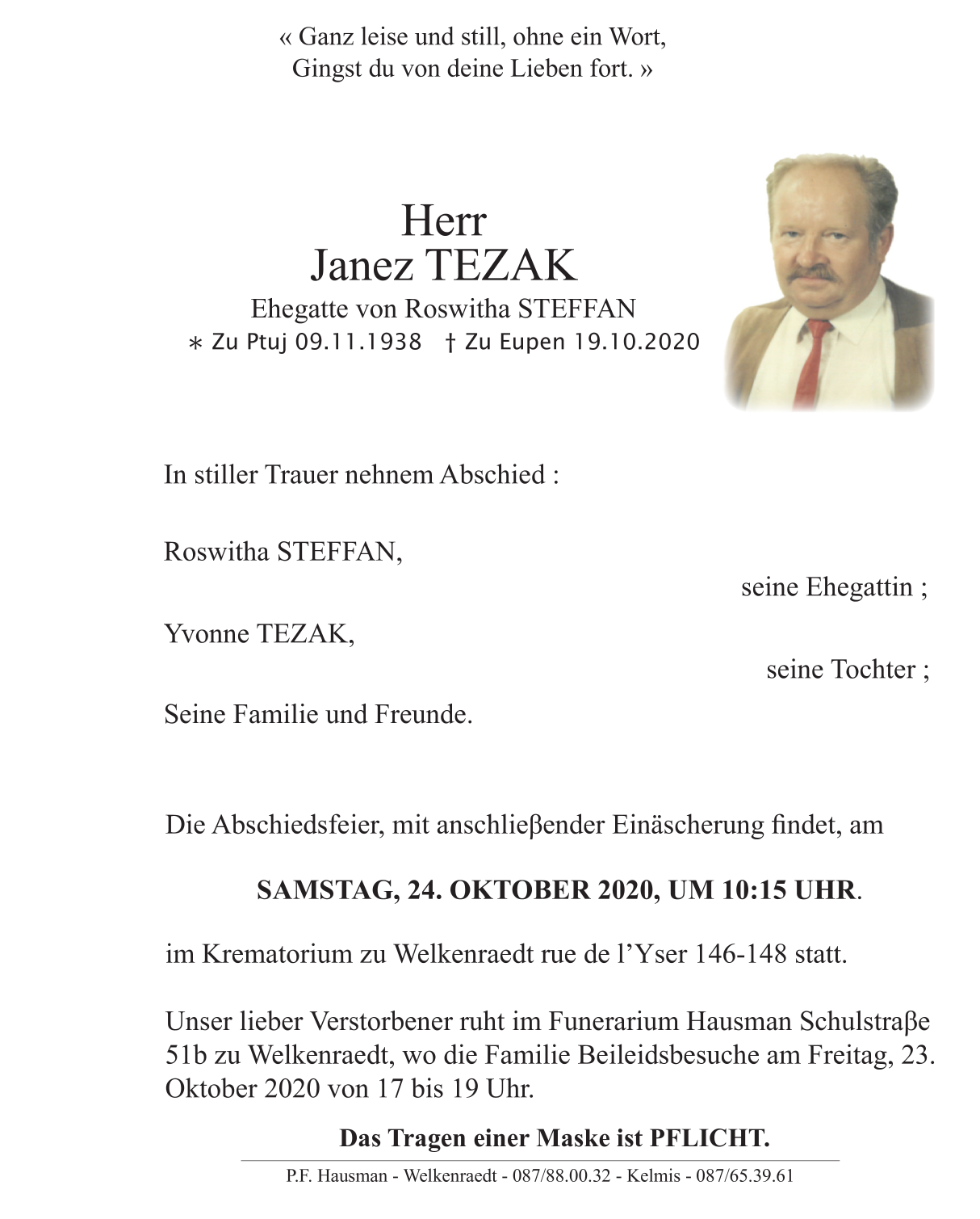 Décédé à Eupen (4700) le lundi 19 octobre 2020 à l'âge de 81 ans