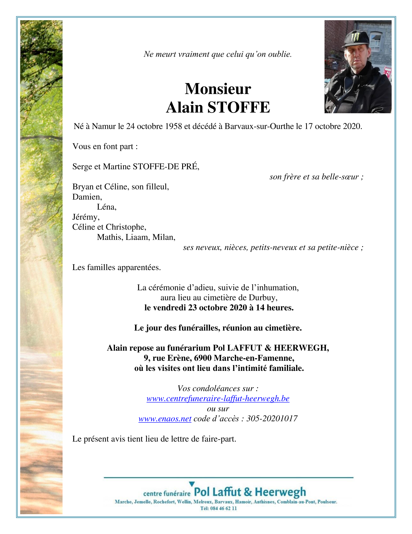 Décédé à Barvaux-sur-Ourthe (6940) le samedi 17 octobre 2020 à l'âge de 61 ans