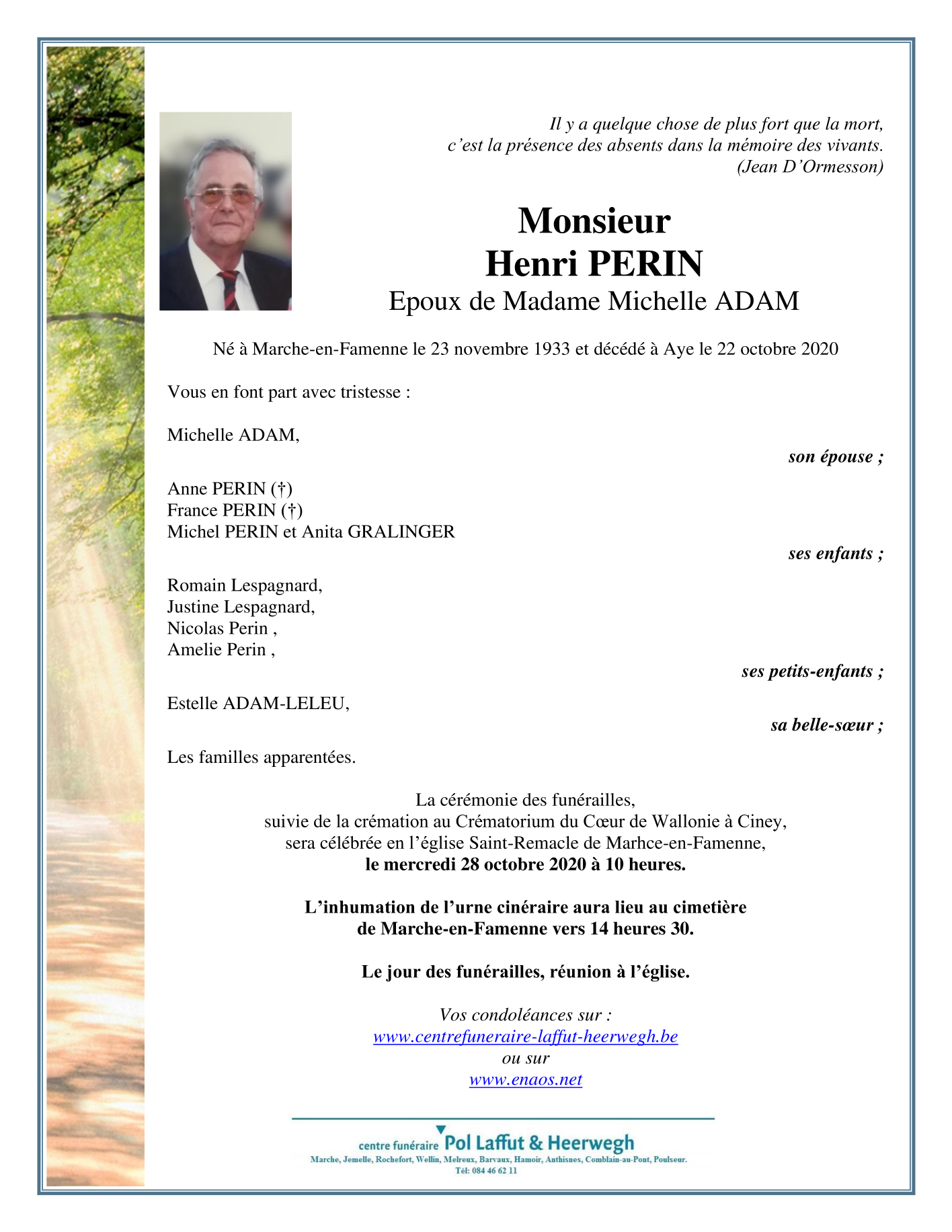 Décédé à Aye (6900) le jeudi 22 octobre 2020 à l'âge de 86 ans