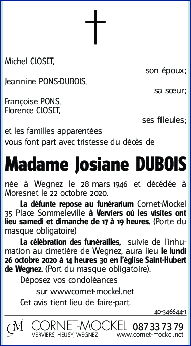 Décédée à Moresnet (4850) le jeudi 22 octobre 2020 à l'âge de 74 ans