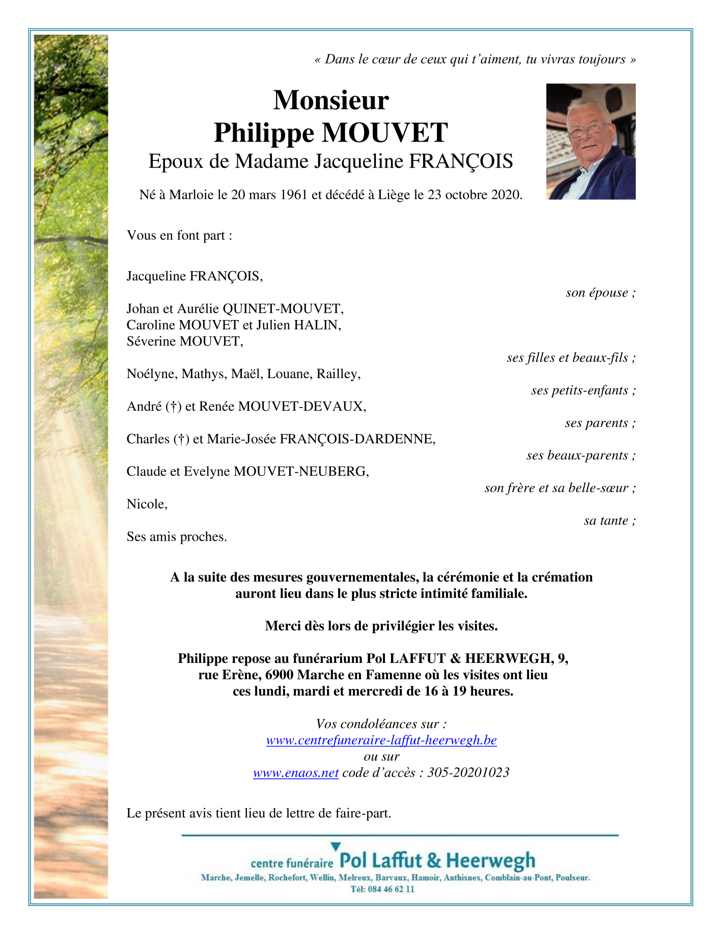 Décédé à Liège (4000) le vendredi 23 octobre 2020 à l'âge de 59 ans