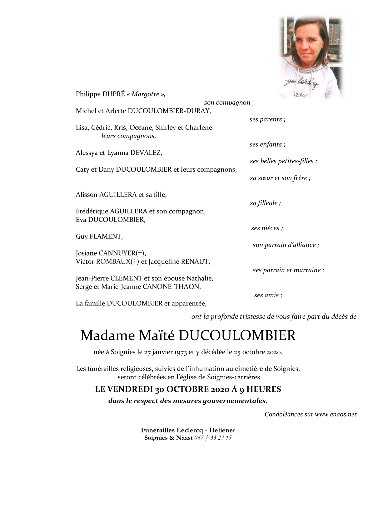Décédée à Naast (7062) le dimanche 25 octobre 2020 à l'âge de 47 ans