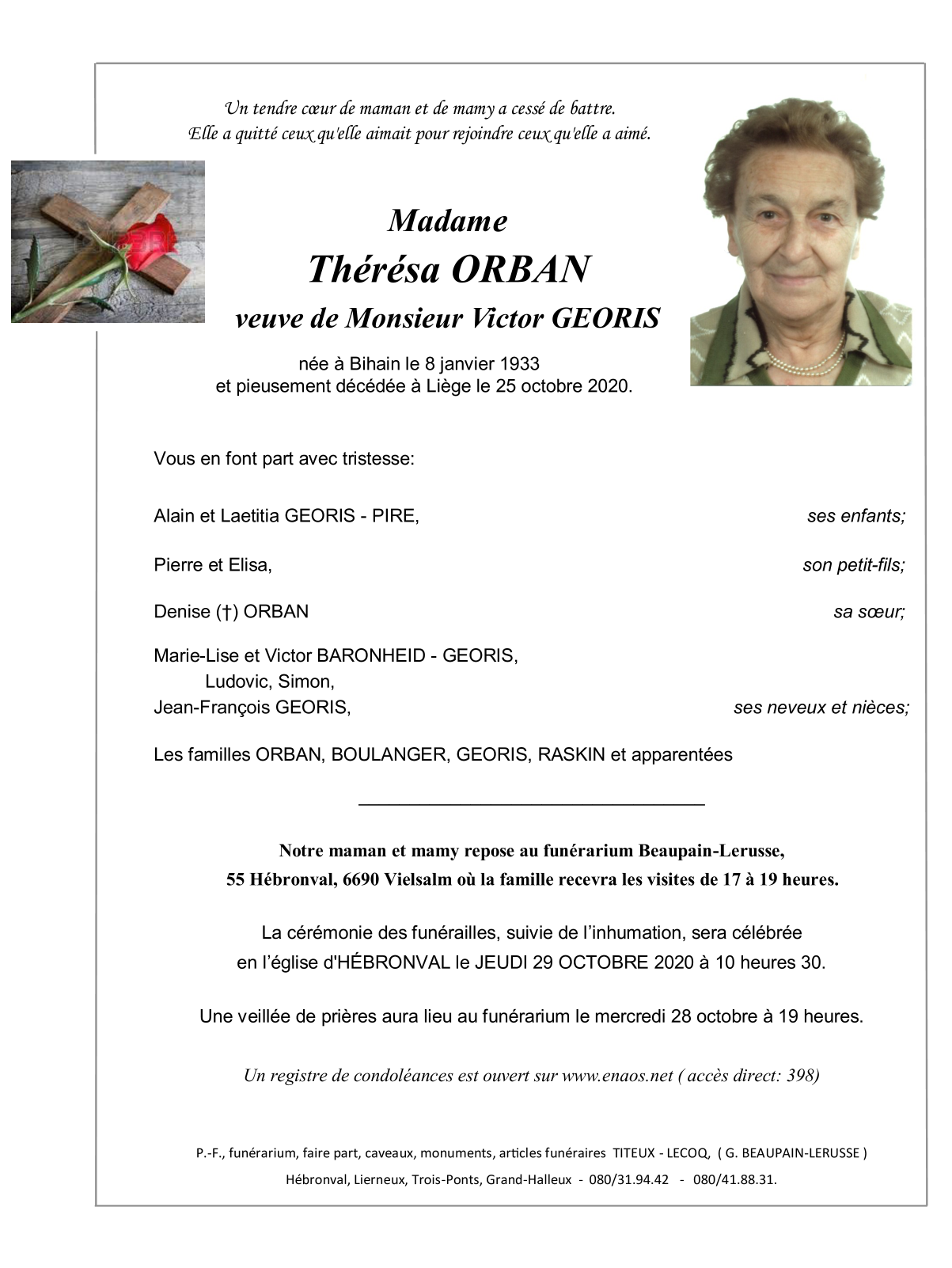 Décédée à Liège (4000) le dimanche 25 octobre 2020 à l'âge de 87 ans