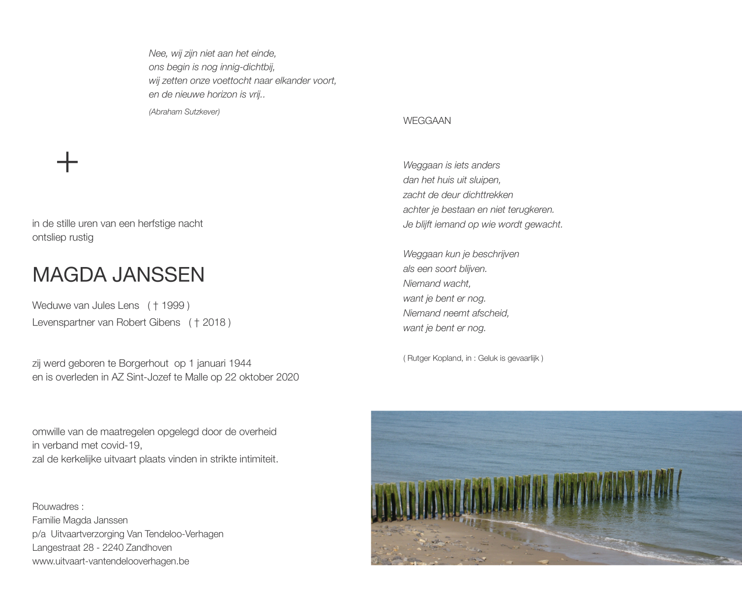 Décédée à Malle (2390) le jeudi 22 octobre 2020 à l'âge de 76 ans