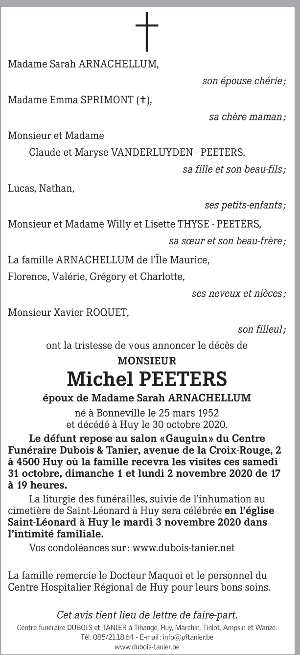 Décédé à Huy (4500) le vendredi 30 octobre 2020 à l'âge de 68 ans