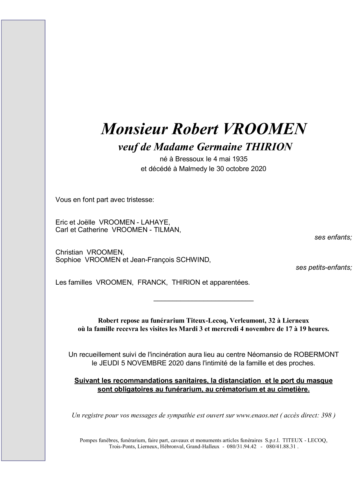 Died in Malmedy (4960) on 30 October 2020 at the age of 85 years