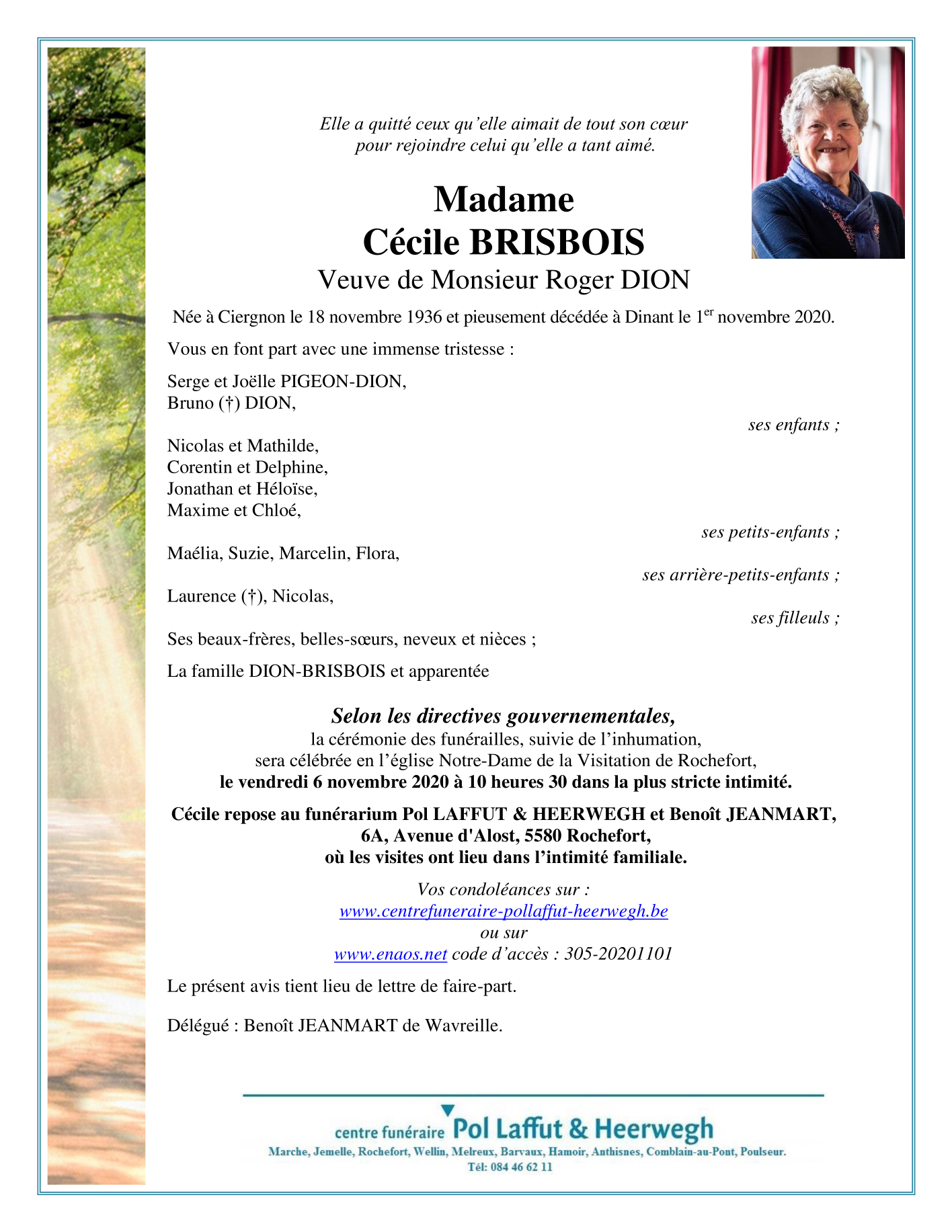 Décédée à Dinant (5500) le dimanche 1 novembre 2020 à l'âge de 83 ans