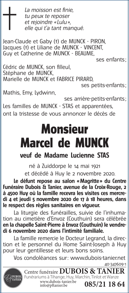 Décédé à Huy (4500) le lundi 2 novembre 2020 à l'âge de 99 ans
