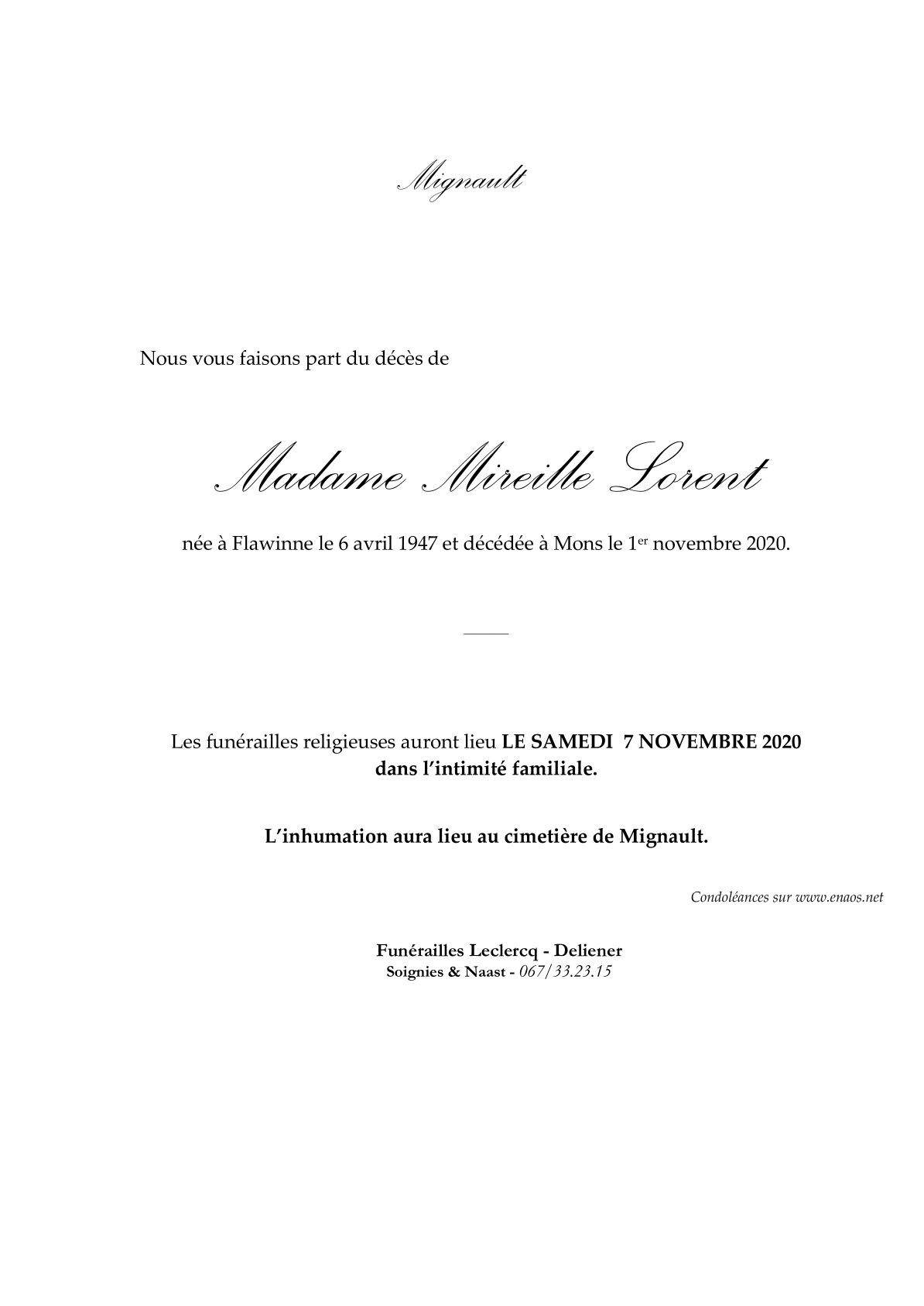 Décédée à Mons (7000) le dimanche 1 novembre 2020 à l'âge de 73 ans