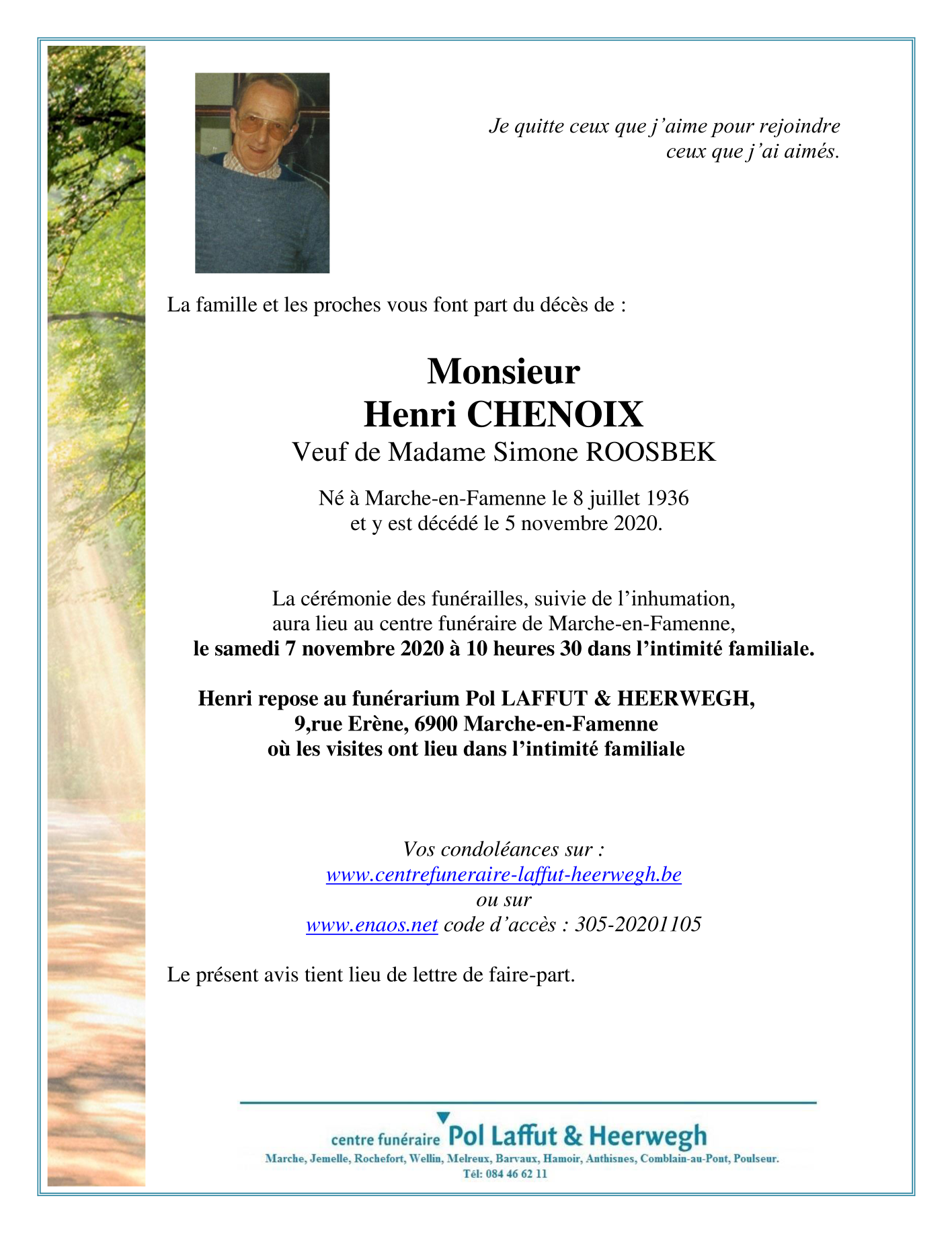 Décédé à Marche-en-Famenne (6900) le jeudi 5 novembre 2020 à l'âge de 84 ans
