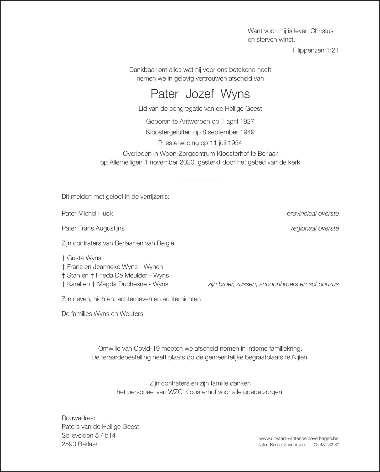 Décédé à Berlaar (2590) le dimanche 1 novembre 2020 à l'âge de 93 ans