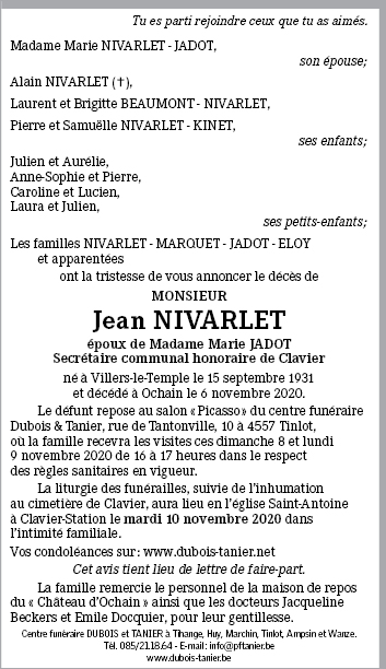 Overleden te Ochain (4560) op vrijdag 6 november 2020 op 89-jarige leeftijd
