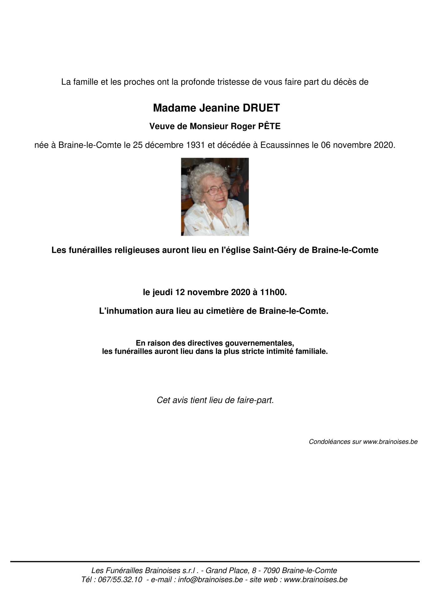 Died in Ecaussinnes (7190) on 06 November 2020 at the age of 88 years