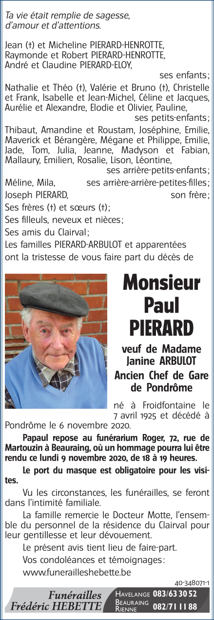 Décédé à Pondrôme (5574) le vendredi 6 novembre 2020 à l'âge de 95 ans